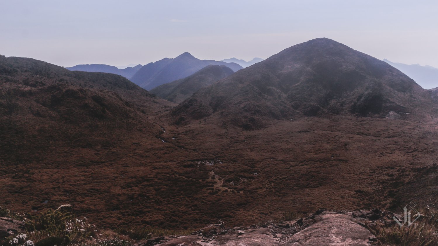 No terceiro dia, dei uma enrolada pra arrumar as coisas. Fiz umas fotos, comi a última maçã e desci rápido até o trecho de charco e entrei no Vale do Huá. Esperei ali na sombra até conseguir ver outras pessoas começarem a descer para o vale também. De lá de cima certamente elas me veriam indo pro lado errado se eu fizesse isso. O vale é uma área confusa de trilhas entre moitas altas de mato e sem muita referência visual. Certamente ficaria complicado seguir nesse labirinto se a neblina descesse.