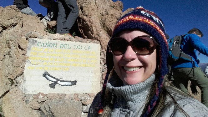 No dia seguinte fui ao fantástico tour pelo vale dos condores em Chivay, a van passou no Hostel às 2:30h da madrugada, fazia muito frio e logo que entrei o motorista me deu um cobertor. Relaxei na poltrona e encostei meu lado direito no vidro da janela. A van pegou a estrada, não vi nada porque cochilei e estava escuro, de repente acordei muito enjoada, forte dor de cabeça e a sensação que estava tonta preste a cair. Tentei sentar melhor na poltrona, porém meu casaco colou no vidro meio congelado. Fiquei quieta sentindo esses sintomas e doida para a van parar. Por minha sorte amanheceu e chegamos ao vale. Eu tentando disfarçar meus sentimentos e angustias, enquanto tentava curtir o tour e observar o voo do condor, que com suas asas formam 3m de cumprimento e pela manhã fazem o voo pelo vale em busca de alimentos. E lindo o animal e um encanto. O passeio incluía almoço e eu só comi uma sopa de chia, não experimentei nada, tinha tantas novidades para meu paladar e eu não aproveitei. Até hoje penso nisso! O passeio continuou e fomos conhecer a cidade de Chivay e sua cultura, onde homens dançam de saia para encantar as meninas, catedrais feitas com silar extraídas do vulcão....