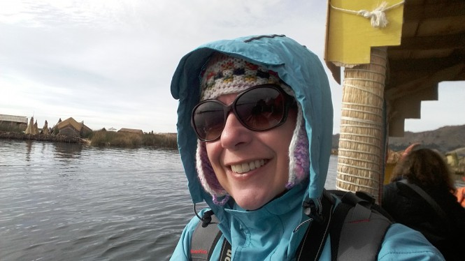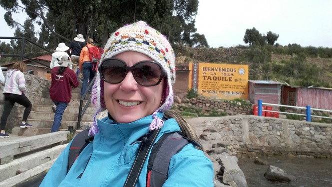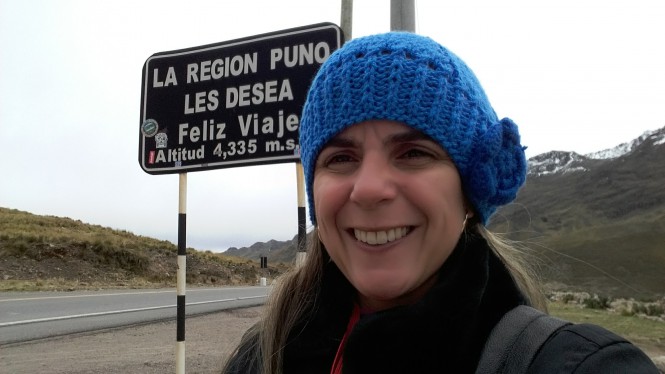 Fomos de ônibus turístico da 4M até Puno, queria conhecer as Ilhas Taquile e as Flutuantes de Uros. O ônibus vai parando em vários miradores, lagunas, lojas de artesanato e vales para fotos rápidas, porque o frio dói o corpo. Em uma dessas paradas eu fui ao banheiro e o ônibus me esqueceu, porém passou 10 mim eu já estava triste, sentada quase chorando sem saber como fazer, sem documento somente com um trocadinho no bolso. Escutei uma voz do meu lado, era a aeromoça do ônibus, toda carinhosa comigo me pediu desculpas e voltei ao ônibus. Não posso questionar nada sobre esse fato, poderia ter acontecido com qualquer outro passageiro, eu quem deveria ter avisado que minhas idas ao banheiro não eram só pipi, pois ainda estava no processo de melhora das dores de barriga, apesar de já está muito bem do perregue que passei em Arequipa.