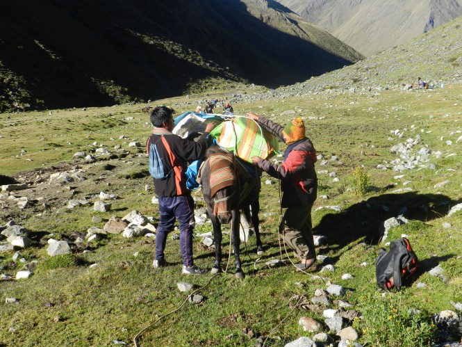 No segundo dia o objetivo era caminhar da cidade de Soraypamapa até Colpapampa. Todo momento sonhava com a cidade inca e seus sítios arqueológicos. Alguns dos amigos que ali conheci, já estavam sentindo o mal de altitude, pois não se aclimentaram. Sua viagem foi de Cusco direto para trilha, como eu já tinha passado muitos problemas com os sintomas, já desconfiei que não conseguiriam continuar a trilha caminhando por conta própria. Nesse momento, foi triste ver os cavalos levando as pessoas naquela subida infernal. Eu caminhava devagar queria ver e fotografar todas as paisagens que não são comuns no Brasil. Nesse momento observei o sofrimento de uma mula carregadeira. Os sherpas vendam seu rosto para que não vejam o peso que levam, pois caso contrário o animal sai correndo. Não foi muito agradável ver a cena, porém senti que já estão acostumadas e são animais muito bem tratados. Chegamos ao ponto mais alto da caminhada o monte Salkantay ele possui 6.271m de altitude e nós estávamos aos seus pés com 4.630m. Eu quase chorei em silencio por poder admirar tamanha beleza. Foi então que os guias nos presentearam com uma folha de coca e explicaram que deveríamos colocar embaixo de uma pedra e oferecer a Pachamama (Deus Inca), em agradecimento por permitir caminhar em sua terra. Esse momento foi emocionante eu já estava chorosa e permiti que as lágrimas rolassem de meu rosto sem o sentimento de vergonha. Feito o ritual continuamos a caminhada, nessa hora foi uma descida abençoada, pois estávamos todos muitos cansados, principalmente os cavalos e mulas.