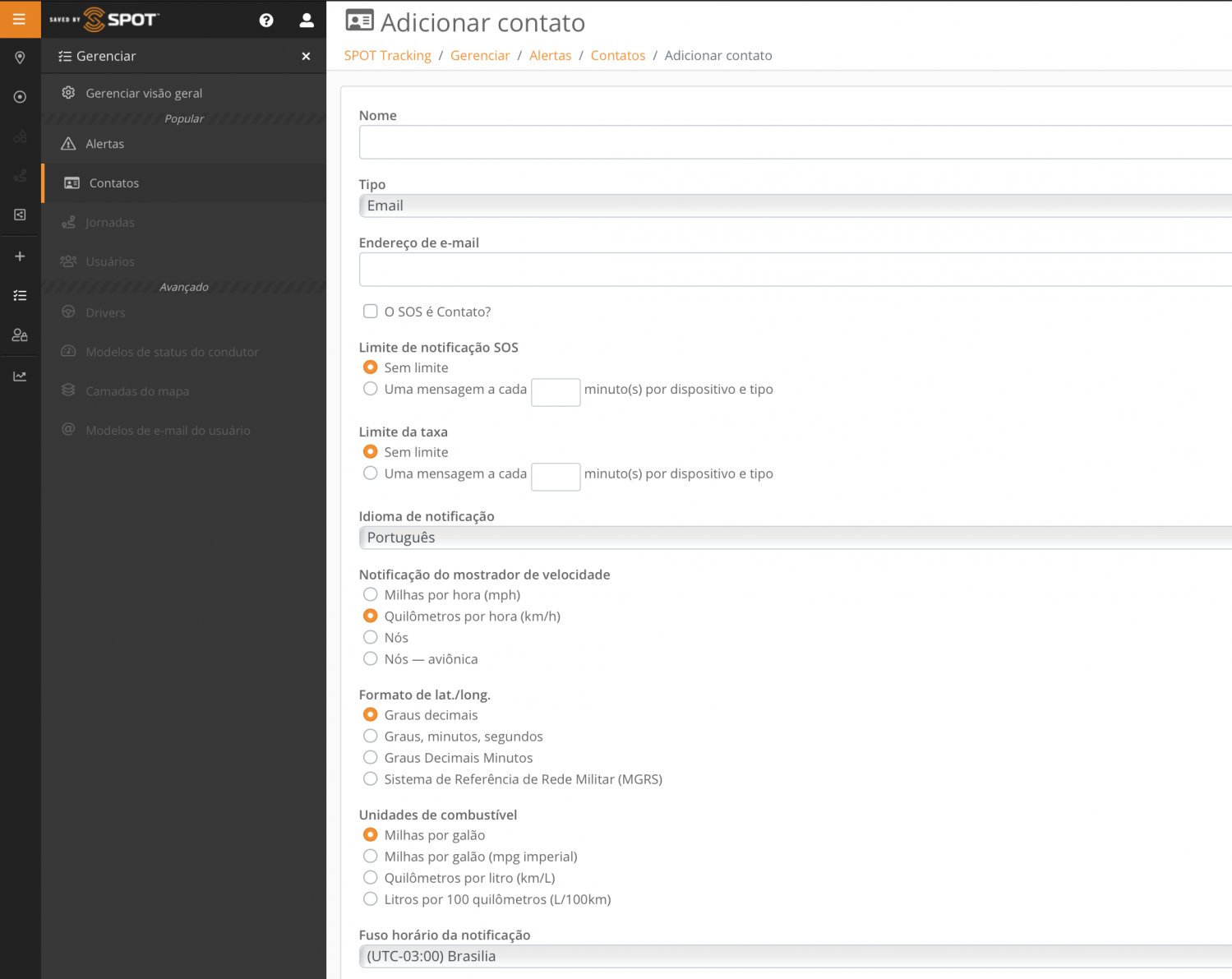 Como visto na Parte 1, clicando no ícone "+" também temos a opção de adicionar "Contato". Os contatos criados dentro da plataforma de Mapeamento não interferem com os contatos que adicionamos na nossa conta SPOT e, que os configuramos para receber mensagem Check/OK, mensagem Personalizada, mensagem de Ajuda, mensagem de Alertas de movimento e serem contactados pela SPOT por ocasião do acionamento de SOS.