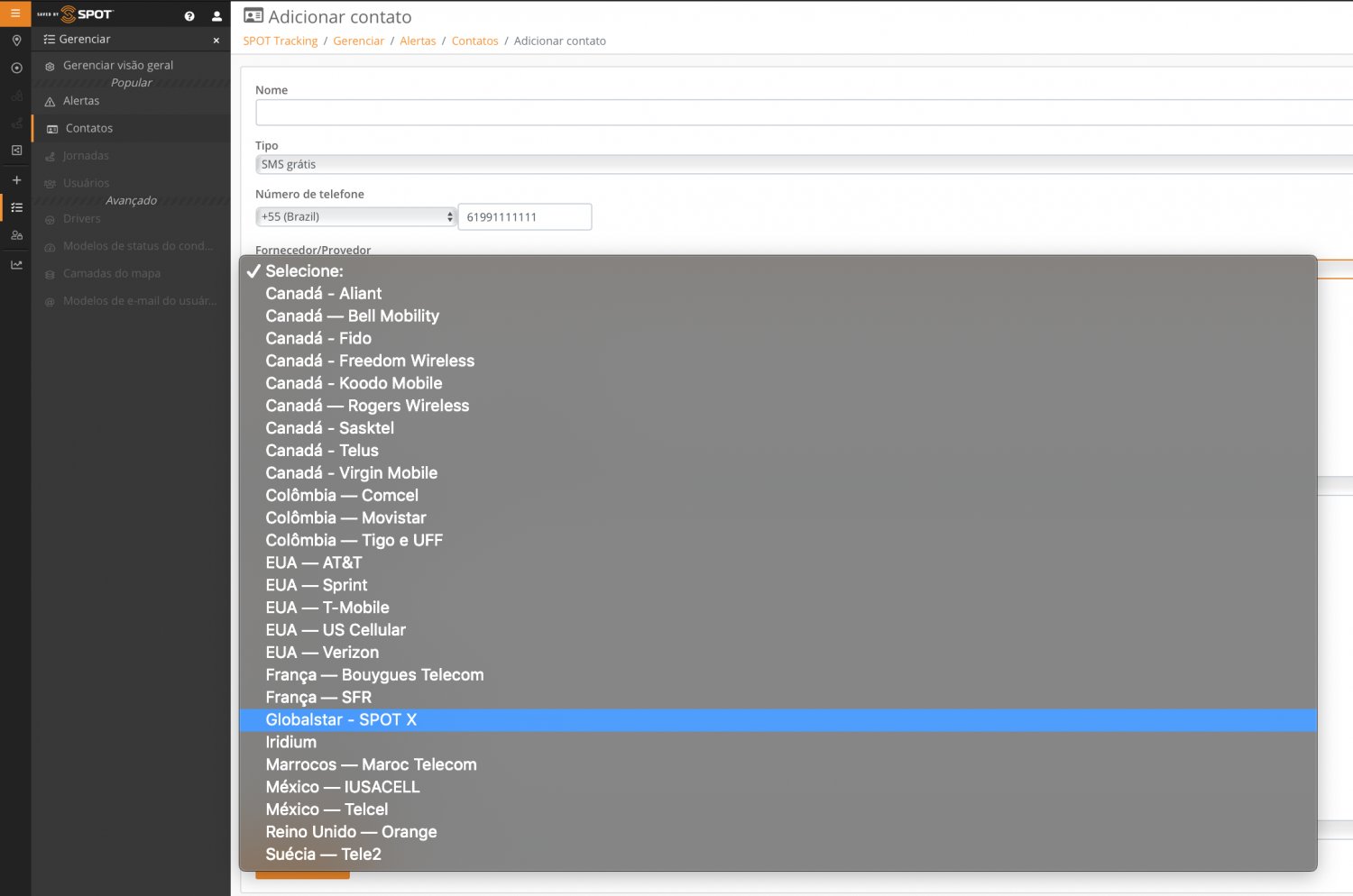 Porém, salvo outro juízo, a opção para criar um contato SMS não está disponível para o Brasil, tendo em vista que na lista de Fornecedor/Provedor não há nenhuma operadora do Brasil. Não sei se a opção "Globalstar - SPOT X" (selecionada na figura abaixo), permite isso para quem tem o SPOT X.