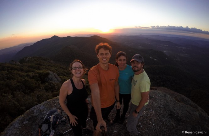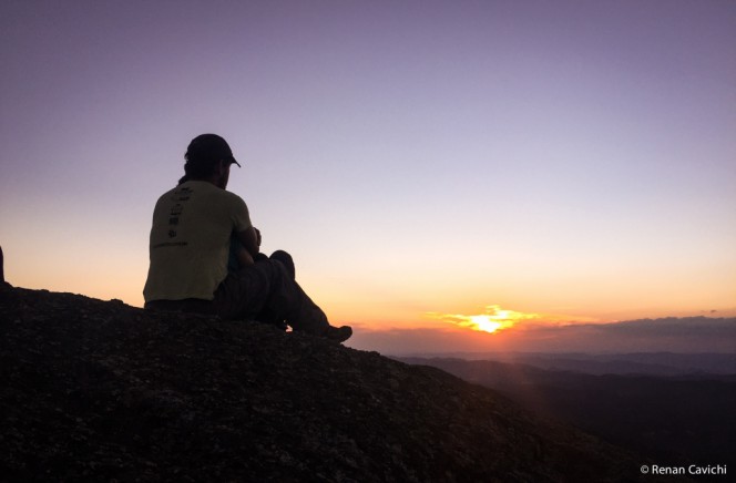 Inicialmente, encontramos uma trilha aberta seguindo naquela direção. Mas essa mesma trilha desaparecia em muitos pontos, o que fez com que nos sentíssemos perdidos com frequência. Pensamos em desistir em vários pontos do vara-mato, até porque teríamos que voltar por ali já depois de escurecer. Mas o cagaço não falou mais alto e seguimos com o perrengue até chegarmos na Pedra Partida, 1h40 depois, ainda a tempo de apreciarmos um lindo pôr-do-sol.