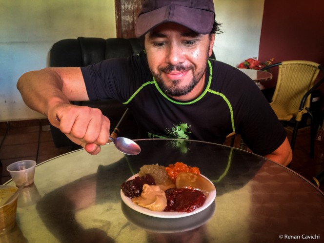 Terminado o almoço, e já pré-bodeados pela quantidade de comida, fomos até o lounge saborear uns “pequenos” docinhos caseiros. Enquanto o Renan tomava um café pra acordar e eu pedia uma porção Tranqueira (um prato com um pouco de cada um dos doces feitos na casa), a Bruna espantava o experiente atendente ao pedir um pote de doce de abóbora e um pedaço de pudim. “É tudo pra ela?” disse ele.