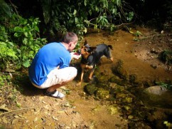seguimos por uma pequena trilha que começa no lado direito da praia e que dá a volta por trás de toda a vila até a Cachoeira do Poço Fundo que tem em contrapartida à sua exuberante beleza, uma quantidade surreal de borrachudos. Toda a volta pela vila, em ritmo de passeio, durou cerca de 1h30 e, por volta das 09h já estávamos retornando ao camping e descobrindo que nosso amigo que chegaria às 12h já havia chegado à tempos.