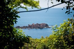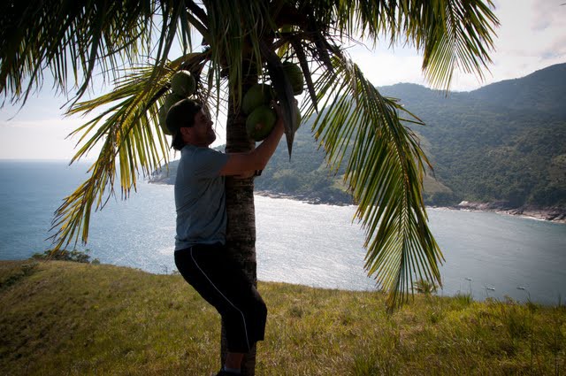 De volta ao bonete encontrei a dupla no camping onde já preparavam um belo almoço com direito a ovos mexidos com queijo parmesão e pequenos pedaços de salaminho (vamos ficar devendo a foto! Quem é que iria pensar em câmera em uma hora dessas ) fizemos um ataque ao morro que fica ao lado da praia (caminho para praia das Anchovas). A vista do morro é fantástica, um visual privilegiado do Bonete à direita, a imensidão do Atlântico à frente e a costa sul da Ilhabela à esquerda. Como se não bastasse o paraíso tomamos uma água de coco apanhado na hora. (Dica: o bastão de caminhada sem ponteira é um ótimo abridor de coco! Já quem não esquece o canivete não precisa se preocupar com essa técnica)