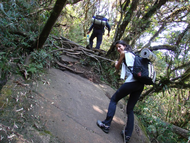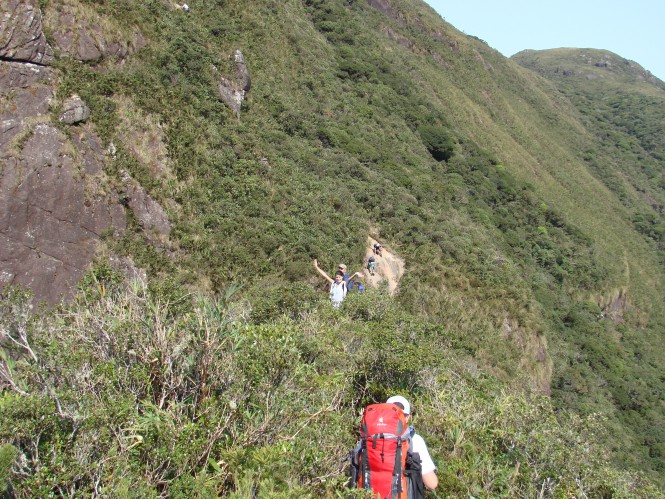 E agora uma foto do lugar que foi barra para mim, confesso que o medo foi muito grande, pensei em acampar por ali mesmo para não precisar passar por aquilo. Não tenho uma foto de perto do lugar, mas é o paredão da foto abaixo. O pessoal ficou lá me dando apoio moral e fisico, mas não queria de jeito nenhum, na verdade até tentei começar a subir, mas não via lugar para colocar o pé e não cair hahaha até que depois de um parto, eu percebi que não podia ficar lá e resolvi subir, fiz isso quase correndo e só parei depois de todos os degraus, já não via ngm atrás de mim, porque eles foram cautelosos e de vagar, contrários a mim que só queria acabar logo com aquilo kkk até hoje tenho receio desse trecho (acho q causou um trauma kkkk).