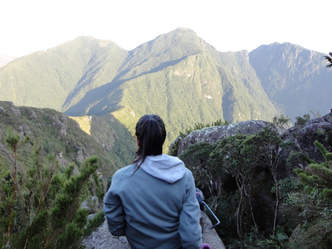 Nós como todos os navegantes de primeira viagem queriamos tirar foto de tuuudo, de todos os ângulos e passar por todos os obstáculos (que as vezes nem precisava kkk), mas passamos por corda e todos os ganchos. Depois de algumas horas avistamos pela primeira vez o Pico Paraná, a vontade de chegar foi maior ainda e junto percebemos de depois de todo aquele tempo, nós ainda estavamos muito longe do objetivo kkk