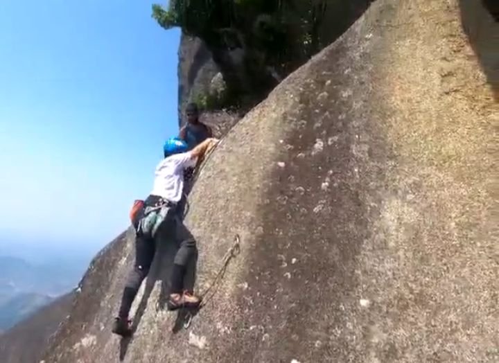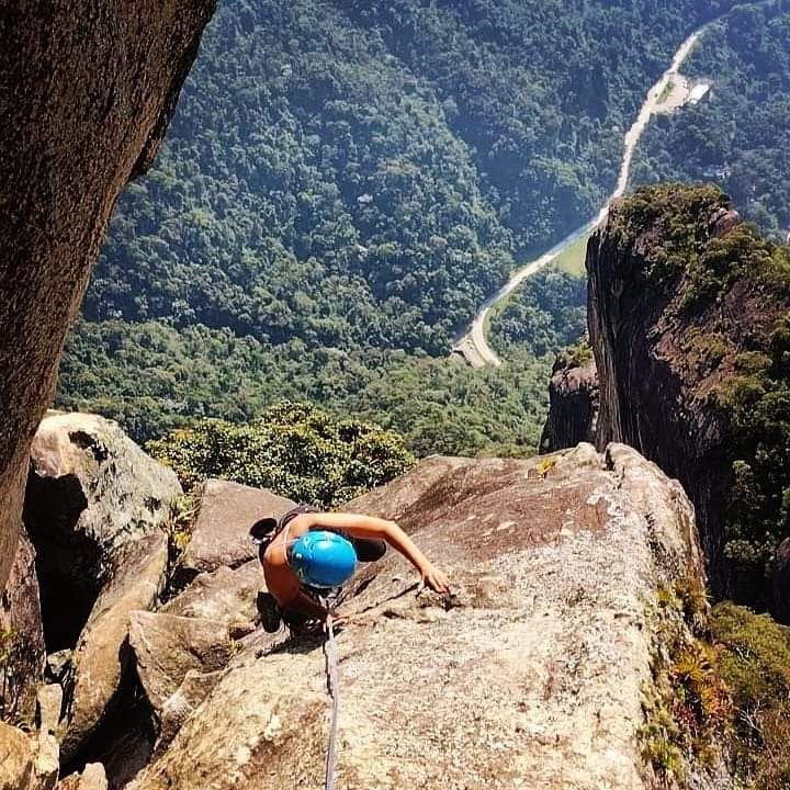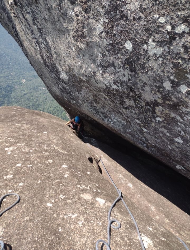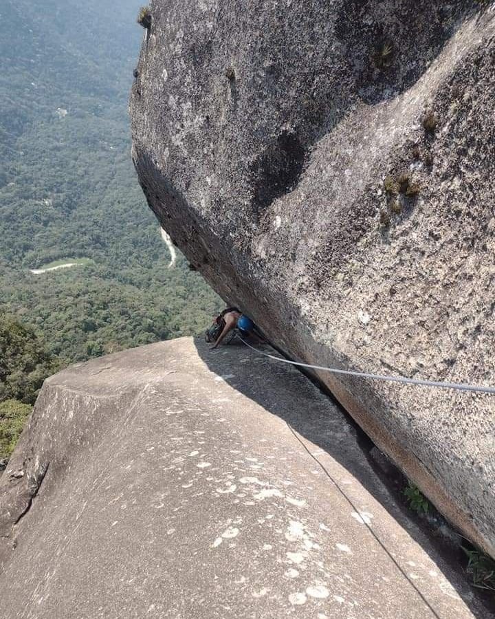 Conversei com ele, disse o que já havia feito em montanha e a única escalada que havia feito em artificial o Dedo de Nossa Senhora. Marcamos um treino no dia 10/09/21 em que ele me passou orientações, fiz uma aderência de 25 metros, um rapel bem tranquilo para me familiarizar com o freio. Aprendi a me ancorar, recolher as fitas que eu ia usar na Maria Cebola. E então era aguardar uma janela boa do tempo para escalar o Dedo.