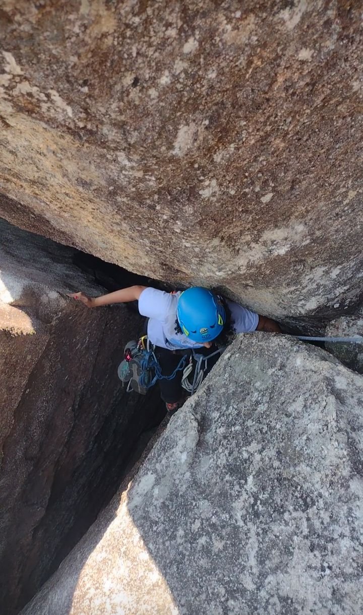 Sem curso de escalada, sem nunca ter feito uma chaminé na vida, mas com muita força de vontade, havia chegado o momento de colocar em prática os mais de vinte vídeos que vi no YouTube sobre como movimentar mãos e pés para fazer uma chaminé, chegou a hora de colocar em xeque os treinos de força na academia.