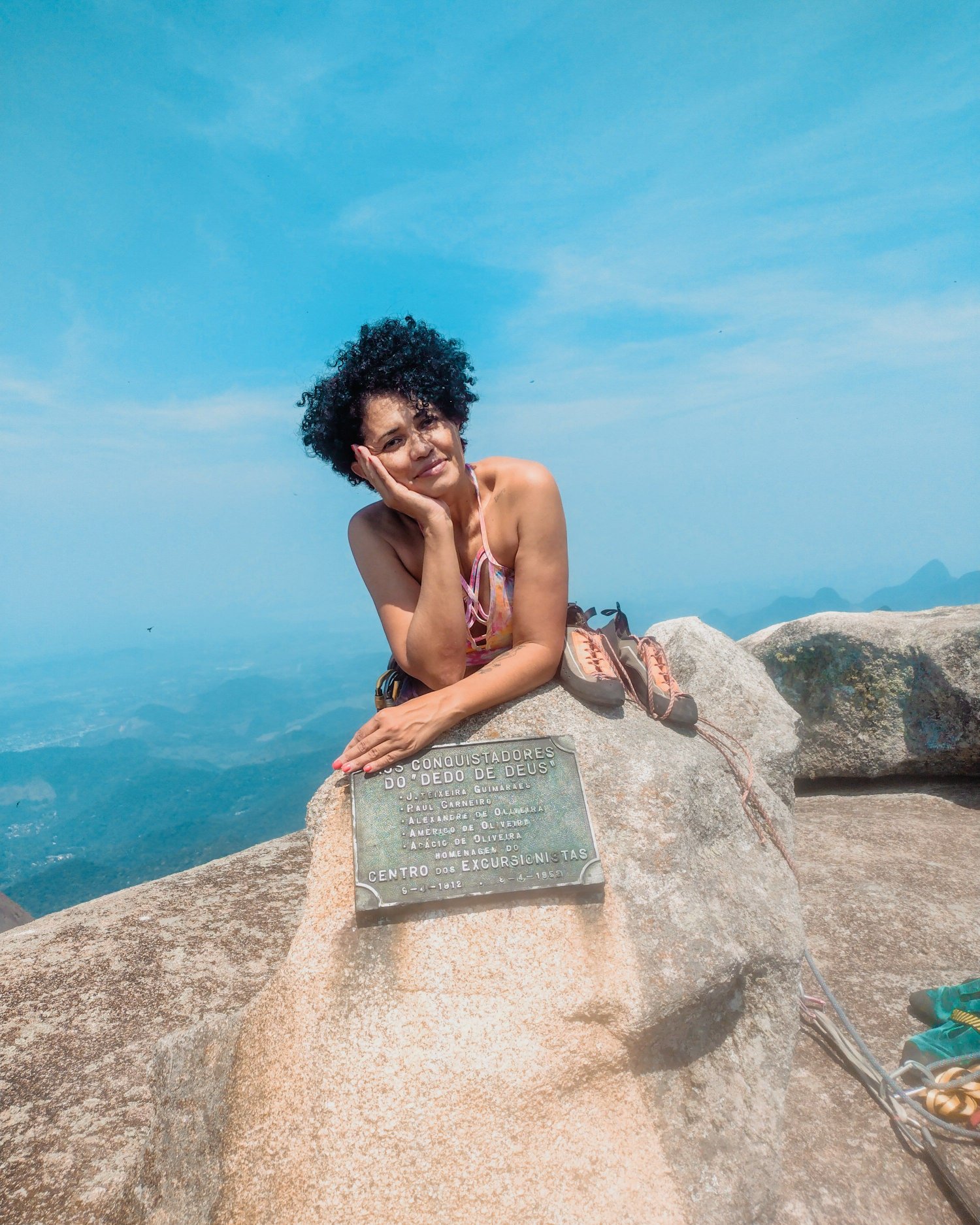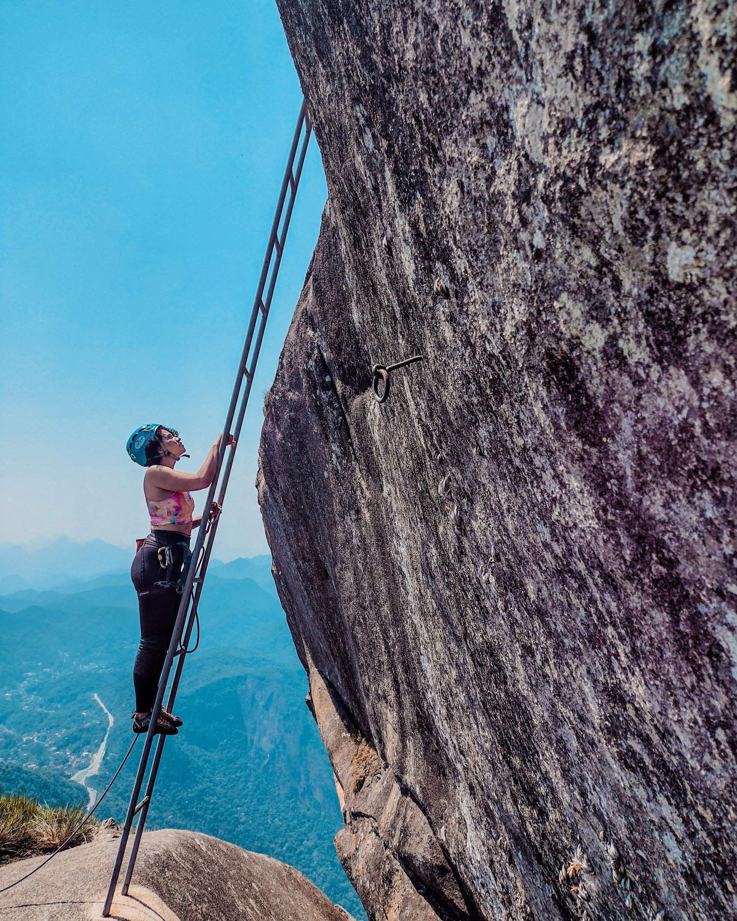E feito o passo caminhei lateralmente por uma fenda que tem uma vista belíssima. Mas também é amedrontador. E sem saber que estava chegando na escada olhei e vi o pé dela. Já subi o trecho chorando, tomada de muita emoção. Corri e abracei o guia, agradeci por ele ter acreditado em mim, por ele ter me ajudado a realizar um sonho de criança.