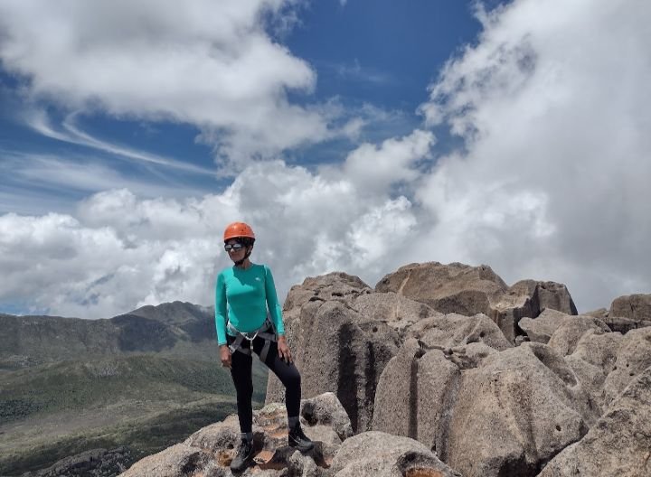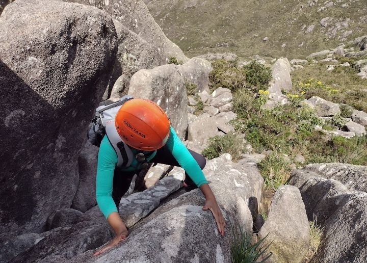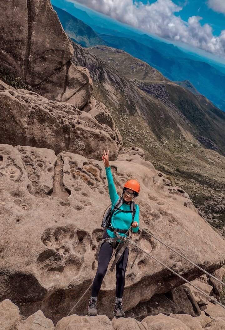 Já perto do cume o guia me encordou para fazer o trecho final. Eu que nunca tinha feito nada com cadeirinha estava pronta para viver uma aventura nova. Ele me passou as orientações e disse: "Não fica com medo, é muito seguro." Foi ali que descobri o paraíso, eu não tenho medo de fazer as coisas na segurança, olha que maravilha!