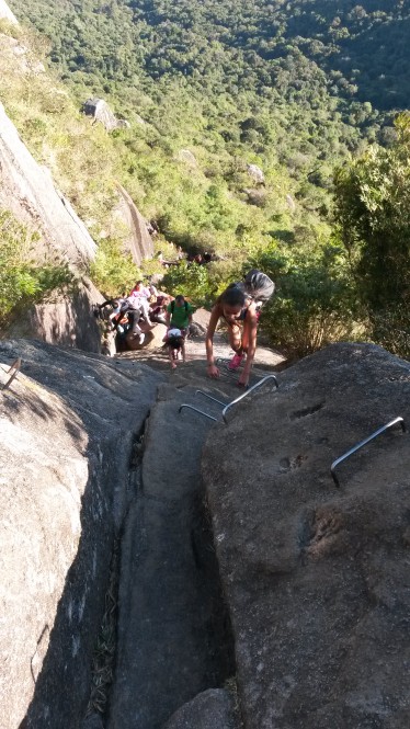 Após quase 40 minutos andando chegamos a área de grampos, formados por umas 4 areás de grampos, a última e maior parte um paredão de 50 metros que assusta aqueles que tem medo de altura, o certo seriamos levarmos cordas para maior segurança, mas o mais experientes ficaram em posições extratégicas para auxiliar os outros a subir, ela em si não apresenta grande dificuldade para subir, apenas o medo que pode travar os iniciantes, mas com calma vai.