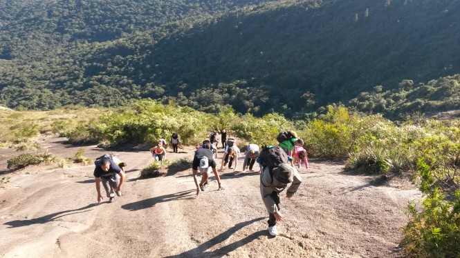 Após os grampos, chega a área de maior esforço físico, um paredão de 45º à 65º como mostrou o GPS, de aproximadamente 300 -400 metros, faz com que o menos preparados cansem fácil, porem com calma se chega hehe, muitos optam pelo auxilio das mãos por dar uma boa estabilidade e confiança para a progressão, os mais confiantes cosneguem facilmente subir correndo, claro com calçados adequados, lembrando que quando chove esse paredão molhado é que aumenta a dificuldade da trilha, mais com tempo seco e limpo foi tranquilo .