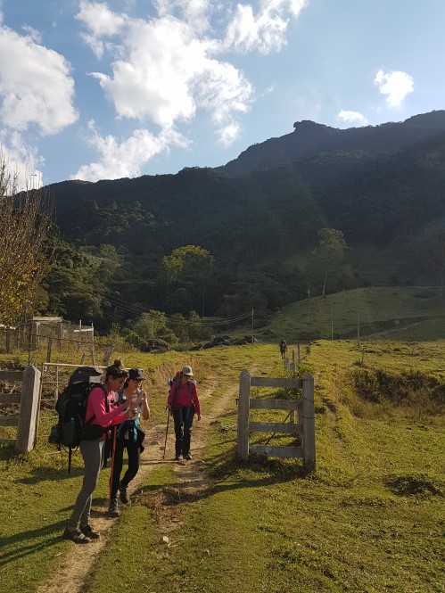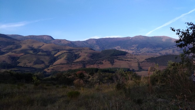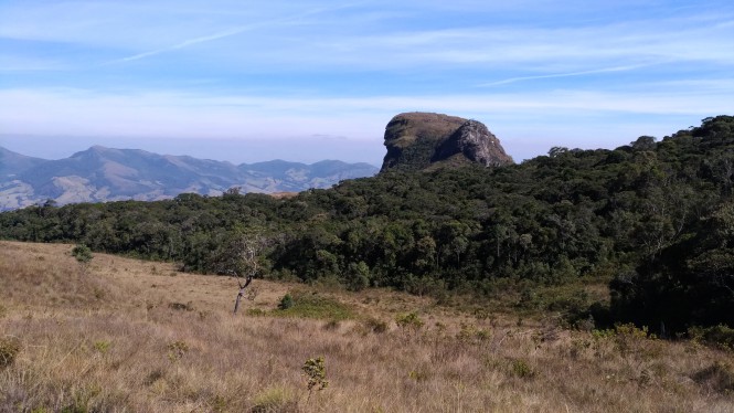 Ao fundo o saudoso Pico do Papagaio. Foto tirada já na chegada ao Trutário, fim da trilha, depois de ter passado por uma descida longa, em um ziguezague coberto por árvores e vegetação e alguns pastos ao longo do caminho.