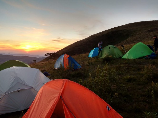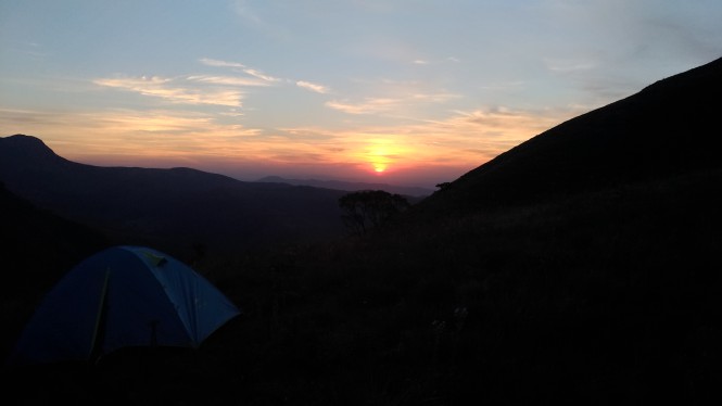 Como perdemos (na verdade aproveitamos) bastante tempo na Juju, ficamos com receio de enfrentar as pirambeiras até o abrigo (casebre) sem muita luz e resolvemos acampar um pouco antes. Buscamos uma área grande e relativamente plana e começamos a armar acampamento com o Sol já se escondendo no horizonte.
