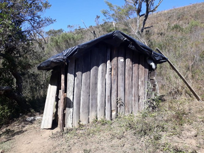 Dentro da pequena cabana, alguns mantimentos deixados por outros viajantes. A partir deste ponto é possível tomar diversas rotas, outro ponto que requer atenção ao GPS/guia.