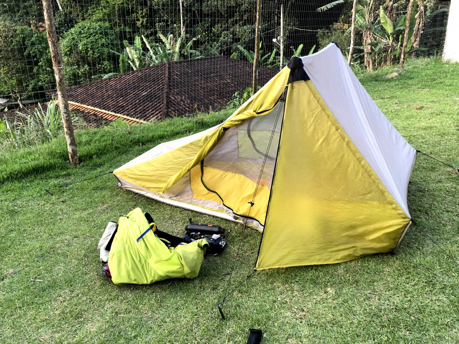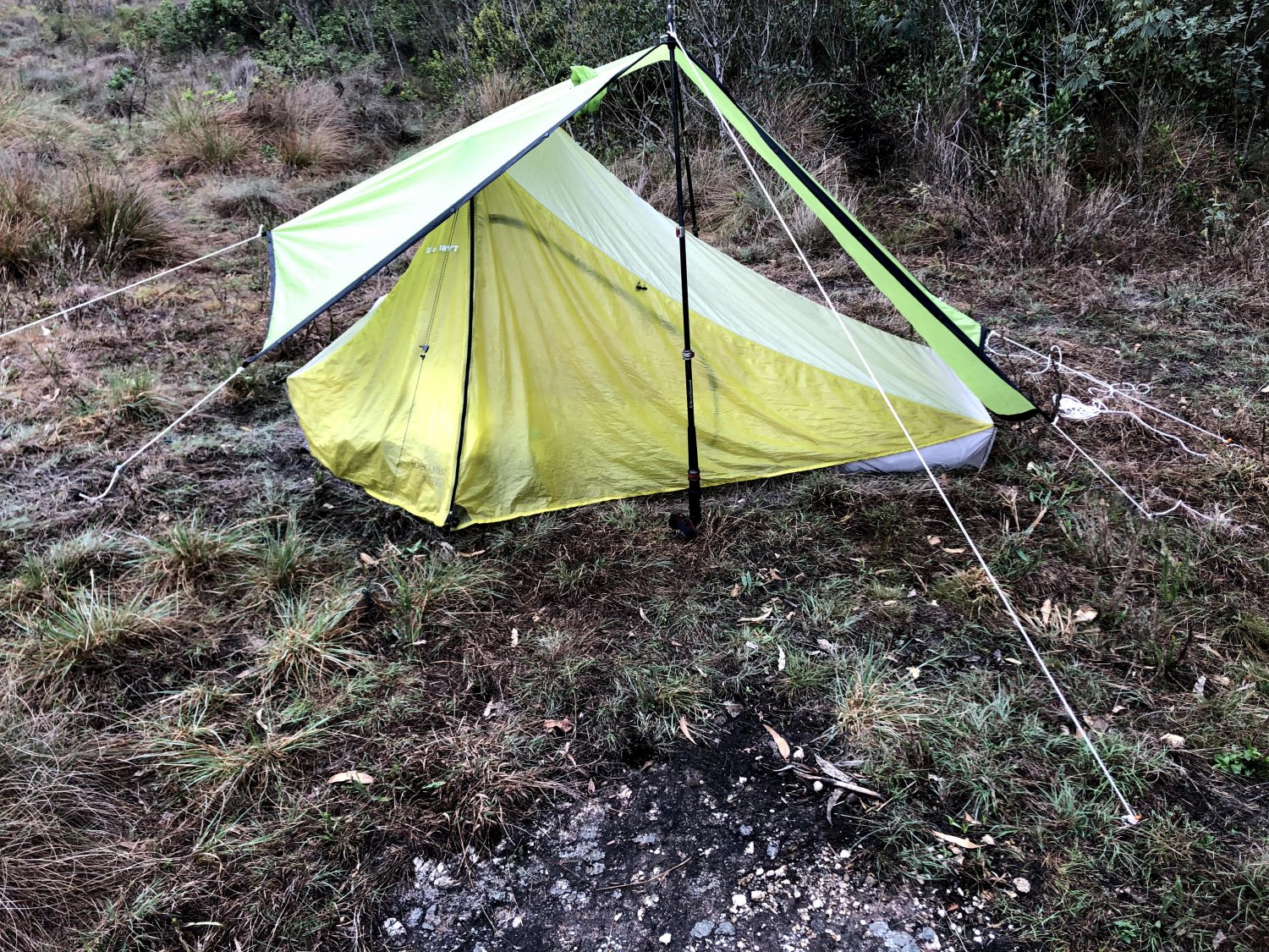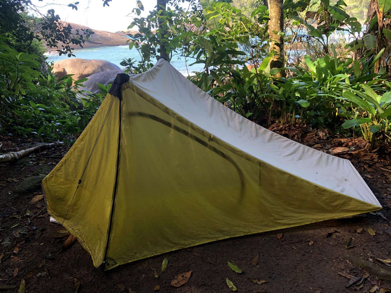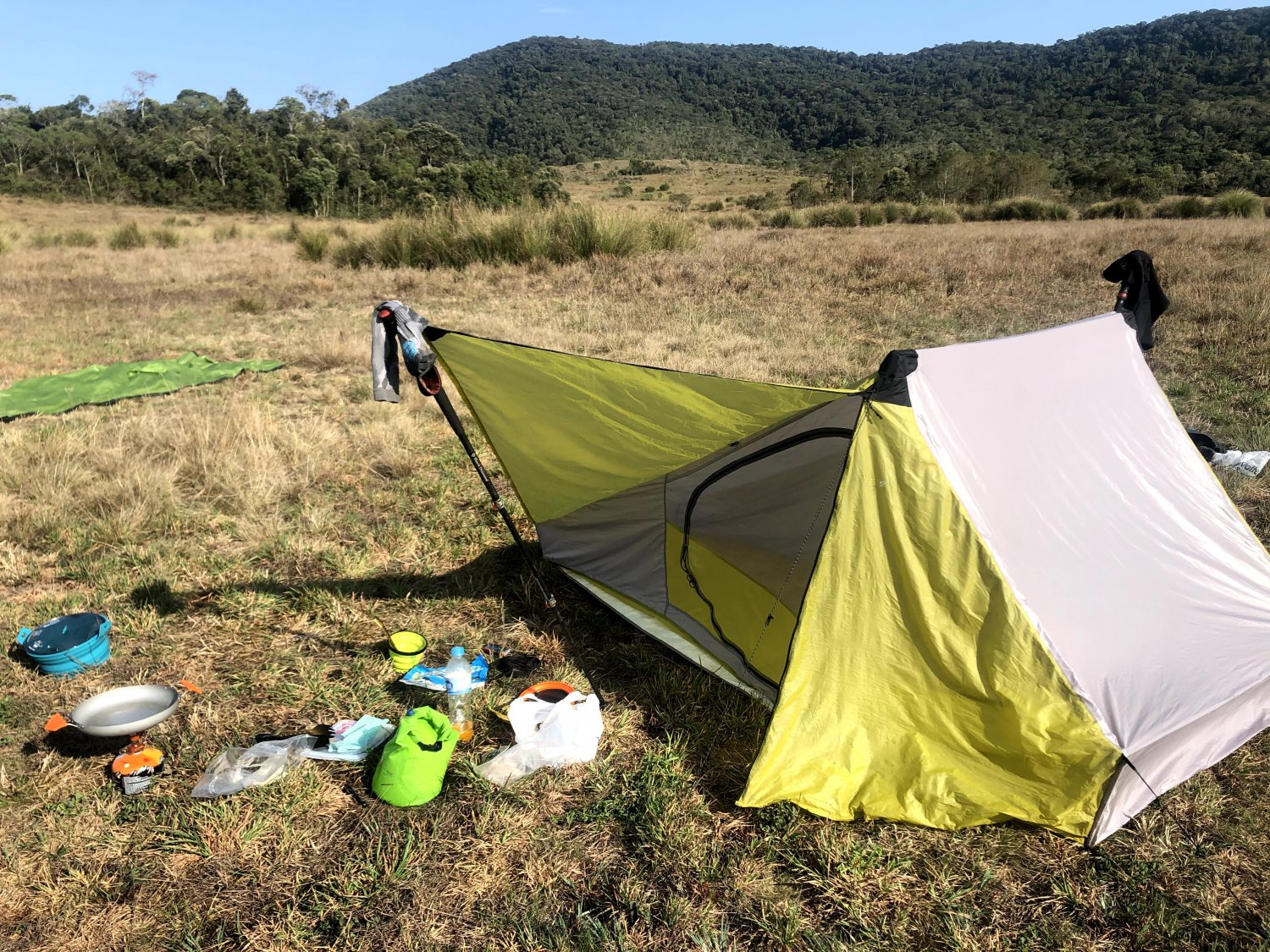 Mas estou bem feliz com a barraca (desde 2014). Já acampei no Pico da Bandeira, El Chalten, Tres Picos, Serra do Papagaio, Ilha Grande, Juatinga, dentre outros. Porque é uma barraca extremamente leve e compacta, e, para uma pessoa, muito confortável.