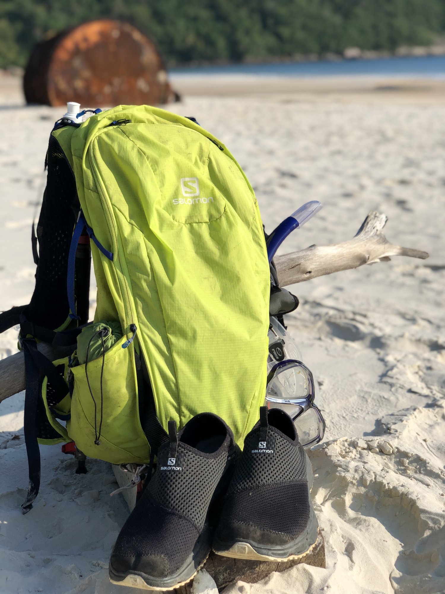 Como disse posso várias mochilas desde uma futura Pro que sozinha pesa cerca de 3,5kg até essa minimalista Salomon de 500g (agora tenho uma nova ultra leve, de 450g).