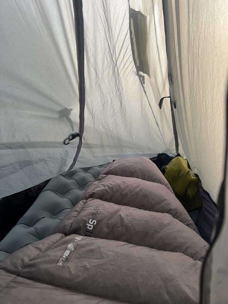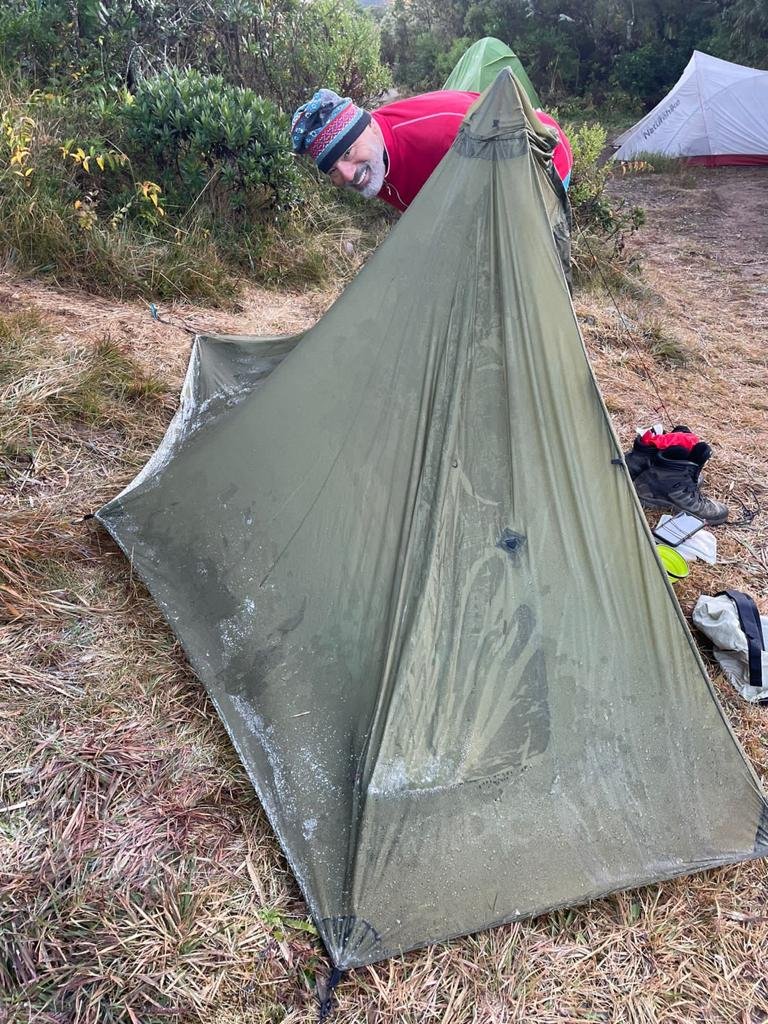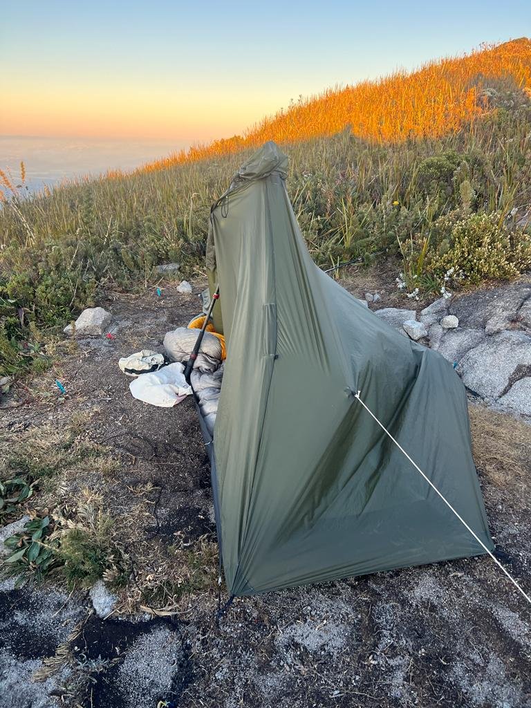 Lembrando que minha barraca é uma gatewood cape (um poncho de nylon 10, muito fino) e com uma boa área de ventilação. Não que uma barraca vá manter o aquecimento, mas acho que tem alguma coisa na “alma” que faz com que pensemos isso. Entao, meu caso, era para assustar. Em todo caso, o que realmente te mantem quente é o isolante (o meu é um s2s de 10cm), saco de dormir adequado (spark 2, também da s2s), e segunda pele. Se mostraram adequados. Senti um pouco de frio ? Sim, mas nada extremo.