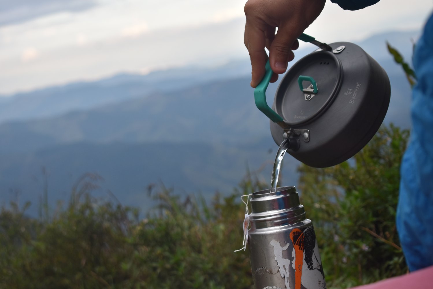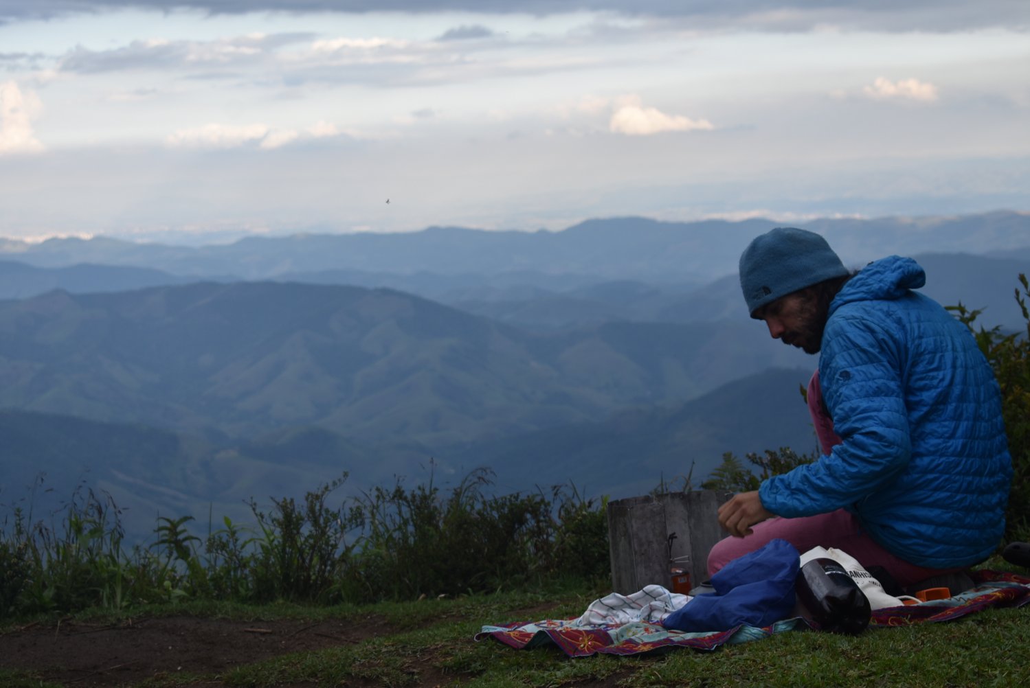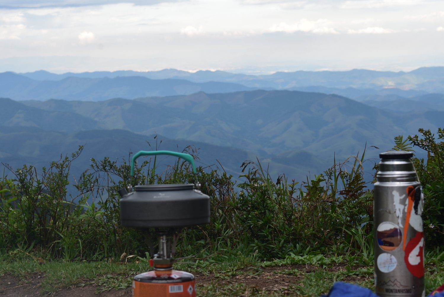 Quando chegamos no topo da montanha, estávamos muito felizes, o lugar era espaçoso e até o momento não tinha ninguém, fizemos um chá, largamos as mochilas e nos sentamos para apreciar a bela vista que aquele lugar nos proporcionava