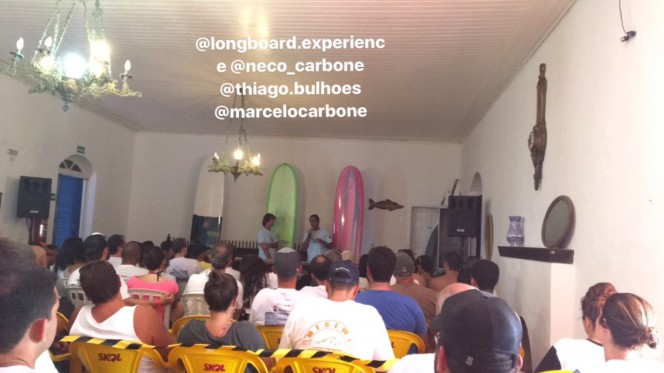 Depois do almoço, e ali perto tem vários restaurantes com ótima comida e preço super acessível, mais palestras com os Carbones, Neco e Marcelo, shapers mais top top explicando os conceitos dos pranchões, para cada tipo de onda e surfe, junto com o Bulhoes que naturalmente entende de tudo, passando sua experiência de pranchas, quilhas e mares.
