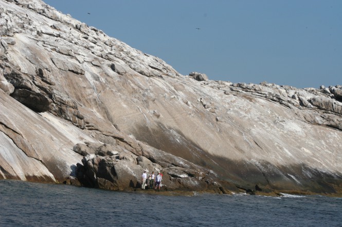 Após o desembarque escalar 33 m de altura em uma pedra lisa, branca (fezes das aves, mais conhecido como guano) e escorregadia também não é facil, e impossível em dias de chuva.