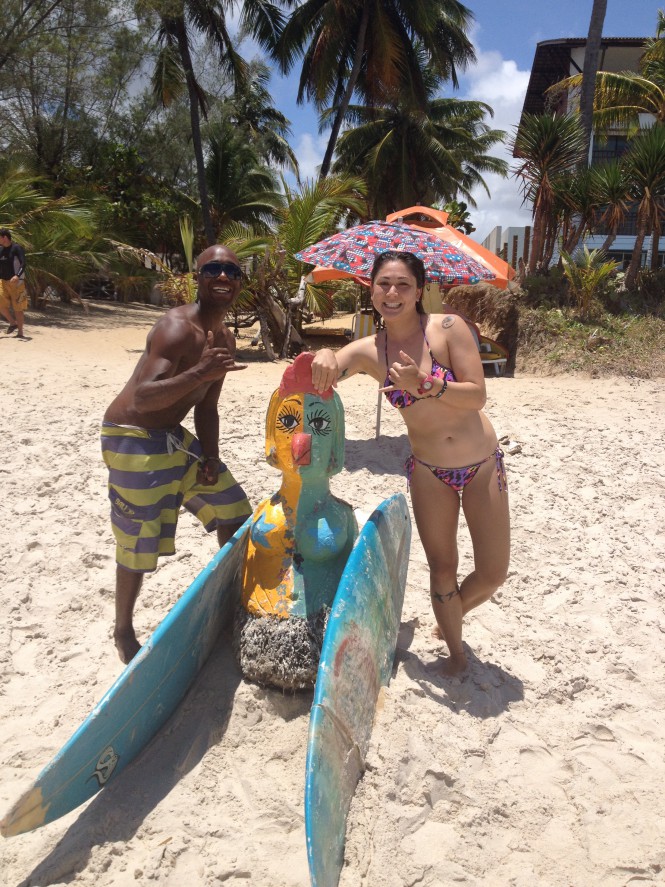Não consegui embarcar a prancha...meu long não entrava no vôo doméstico da Avianca...pergunta se não surtei!? Graças a santa amiga Flávia, que foi buscar no aeroporto a minha "Marcela-Diana" ficamos a salvo, pq senão eu teria que deixar no guarda-volumes de GRU (que é um assalto por dia), e pior...de lá eu imendava minhas férias pra casa do cunhado em João Pessoa...sem minha amada prancha...:( Mas tudo bem né...na próxima quando eu ligar pra perguntar se embarcam pranchas, tenho que dizer que as minhas tem 9 pés no minimo...como eu ia advinhar?! :/Sem choramingos, peguei uma carona com o Leo até a operadora de mergulho que fica no centro de Porto de Galinhas, e fui andando pela praia procurando algum surfista ou algum lugar que alugasse uma prancha... Já tinha tentado falar com a Atalanta, e com a Atahalley surfschool mas além de ser mais ao Sul, a Atalanta estava em Chicama gravando pro Canal Off.