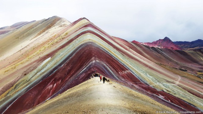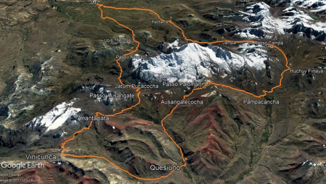 O trajeto original do circuito Ausangate apenas contorna o nevado Ausangate. No entanto, como queríamos conhecer a montanha colorida chamada Vinicunca (ou Winicunca, Cerro Colorado, Rainbow Mountain), prolonguei a caminhada por uma rota alternativa, que eu tive que montar, catando pedaços de tracklogs pelo wikloc, já que não encontrava à epoca, nenhum tracklog com o percurso que eu queria
