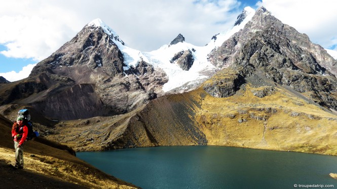 Olhando para trás nós podíamos ver a laguna Jatum Pucacocha, onde acampamos, e sua irmã menor, Uchuy Pucacocha, pouco acima, sendo abraçadas pelo gigante nevado às suas costas. Um cenário de tirar o fôlego , literalmente.