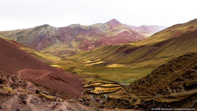 A paisagem que se escondia por trás desse passo era difícil de acreditar. Parecia que eu estava em uma grande tela de pintura. Montanhas vermelhas, pinceladas de marrom e gramíneas verdes e douradas descendo de suas encostas. Lindo, lindo.