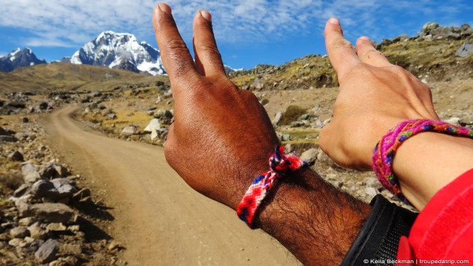 Quando o Emerson finalmente acordou, tomamos o nosso café da manhã, compramos umas coisinhas da mãe do Flávio, para ajudar a família, dentre elas as pulserinhas que ficaram sendo o símbolo da nossa parceria, e as 8:30, demos inicio à caminhada do último dia do Circuito Ausangate via Vinicunca, por uma estrada.