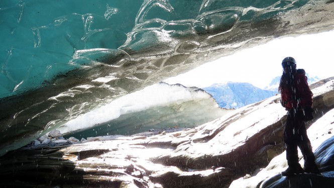 Depois disso iniciamos a caminhada de volta ao barco, mas antes passamos por uma pequena caverna formada entre o glaciar e a rocha abaixo dele. Muito linda também.