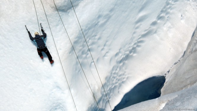 Escalamos duas paredes nesse local, uma ao lado da outra. Posteriormente escalamos novamente uma delas mas não retornamos para baixo.Seguimos a caminhada no topo dela até chegarmos a uma depressão profunda no gelo, a qual teríamos que descer para escalar a parede da frente, ainda mais alta.