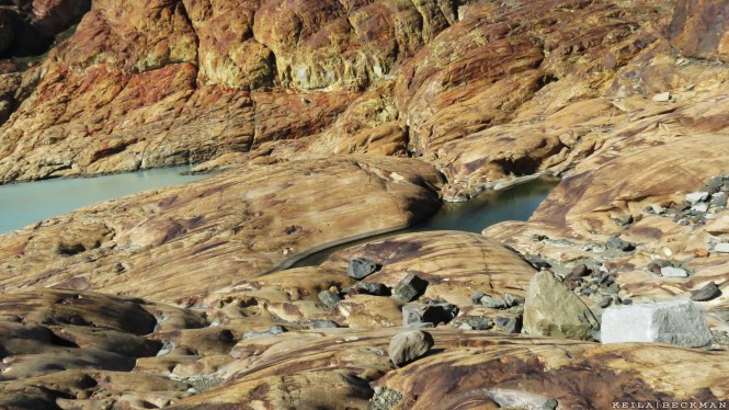 Eu fiquei viajando nessa hora, imaginando os pedaços de rocha sendo arrancados pelo atrito do glaciar com o terreno rochoso embaixo dele; imaginando esses pedaços de rochas, de todos os tamanhos, se atritando com o mesmo terreno rochoso e formando todas aquelas linhas, formas e curvas que se apresentavam aos meus olhos.