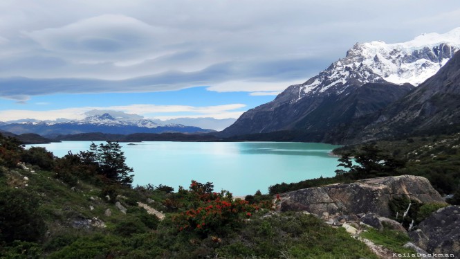 Seguimos a caminhada margeando o Lago Skottsbergl, com os Cuernos del Paine ao fundo.