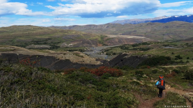 A partir da Laguna de los Patos a trilha segue até o primeiro ponto em que se pode avistar o Glaciar Grey (Mirador Grey), passando a ficar um pouco mais exigente fisicamente, deste ponto, alternando-se entre descidas e subidas, ora por trilhas, ora por trechos de pedra, ora passando por verdes florestas de lengas, ora passando por florestas de galhos queimados (resultado de um incêndio que havia ocorrido a anos), ora nos deparando com uma vegetação de um vermelho surpreendente no chão, ora nos deparando com lindas florzinhas amarelas. A não ser nos trechos de floresta, o tempo todo avistamos o Rio Grey a nossa esquerda e o Glaciar Grey a nossa frente.