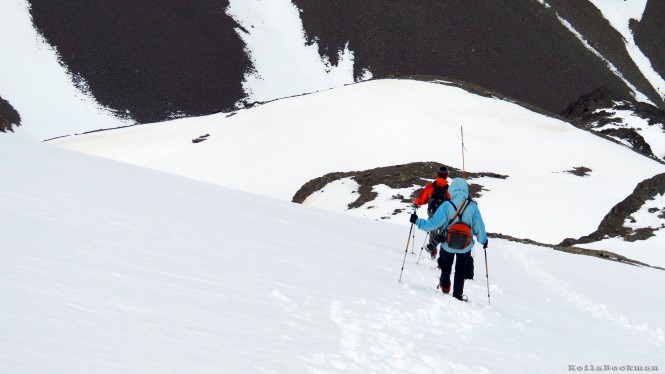 Continuando a nossa caminhada, chegamos a um campo aberto onde só se enxergava neve e alguns trechos de rocha. Conforme íamos caminhando a inclinação ia aumentando e a dificuldade em se andar sobre a neve fofa também. Não chega a ser uma subida difícil, mas exige um certo condicionamento físico.