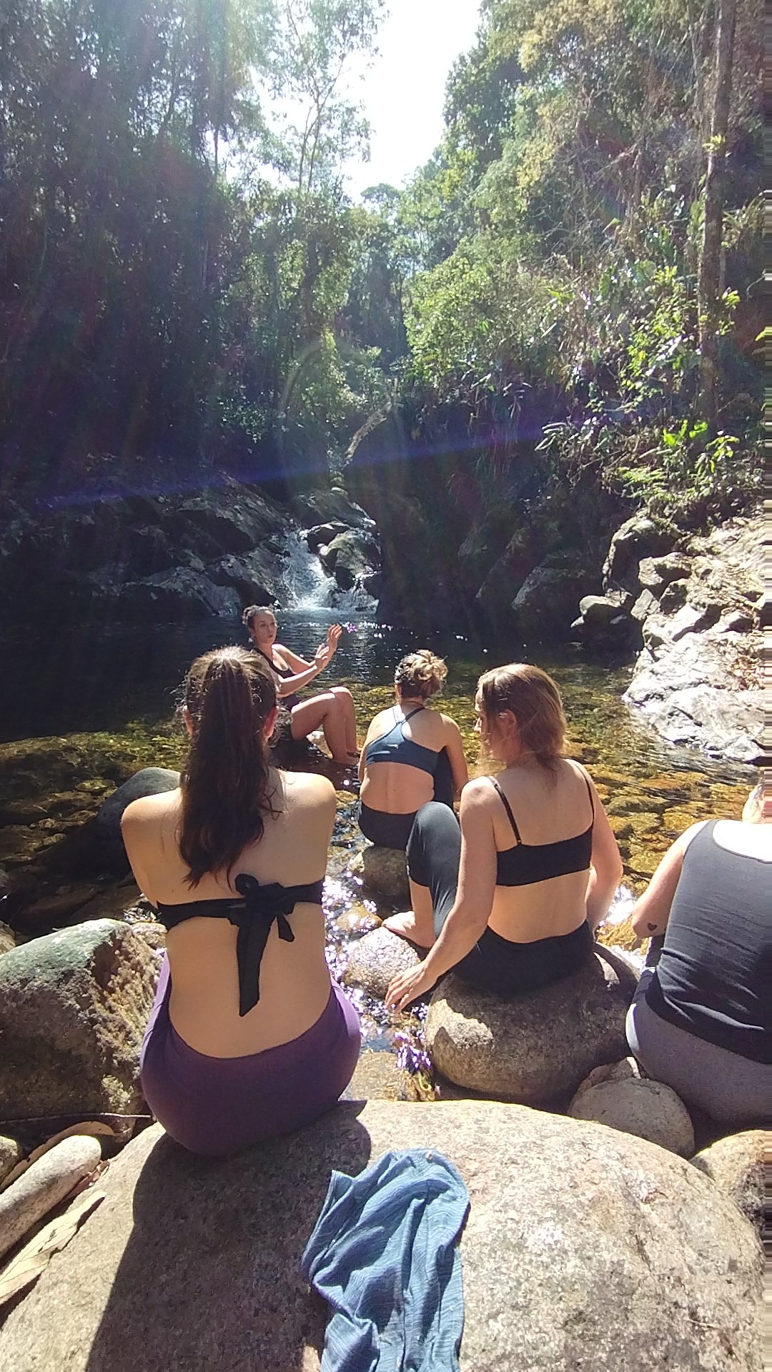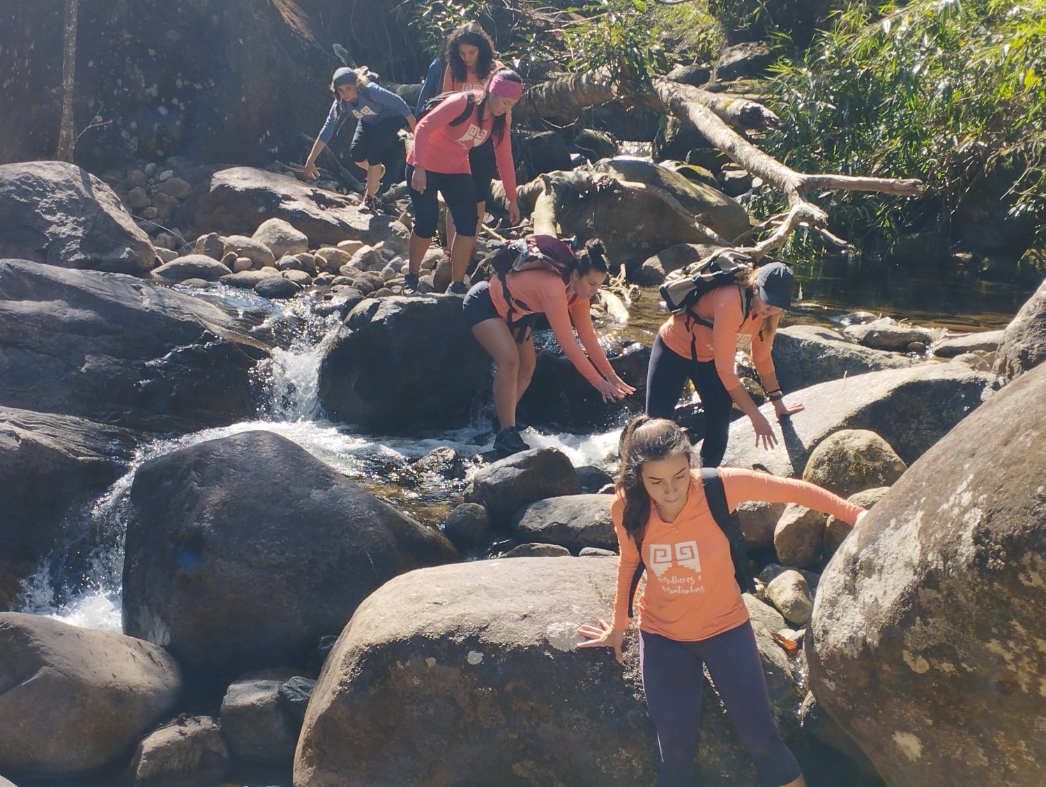 O Primeiro encontro elas tiveram a oportunidade de conhecer um local nunca antes visitado, por um grupo de mulheres, porém, avistado por muitos que cruzam a clássica travessia Marins x Itaguaré, pois é exatamente a região de mata na base do Itaguaré lado paulista. Esse local é a RPPN Gigante do Itaguaré, e está na cidade de Cruzeiro SP, e necessita de autorização e guia exclusivo para entrar na reserva. Vivenciamos um Hiking de 9km, em mata fechada, porém, em trilha histórica, com muitas quedas de cachoeiras, e a contemplação de uma paisagem regenerada, e pouquíssimo visitada, éramos nós, a montanha e a floresta. Além do Hiking, tivemos também Aquatrekking num trecho incrível do Rio Brejetuba, um dos rios abastecidos pela nascente da Pedra Redonda, da travessia Marins x Itaguaré.