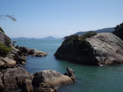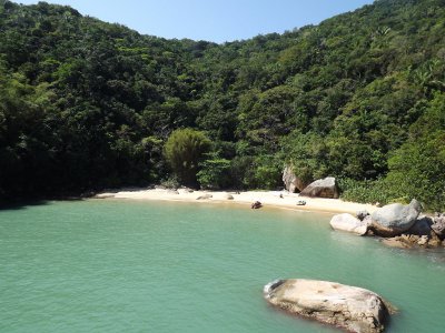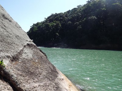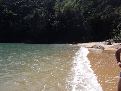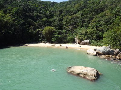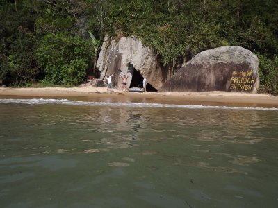 Entrando pela Praia do Guaiuba após 1:30 de remada chegamos a Praia do Moisés na ponta da Pata do Dragão, umas das mais selvagens do Guarujá