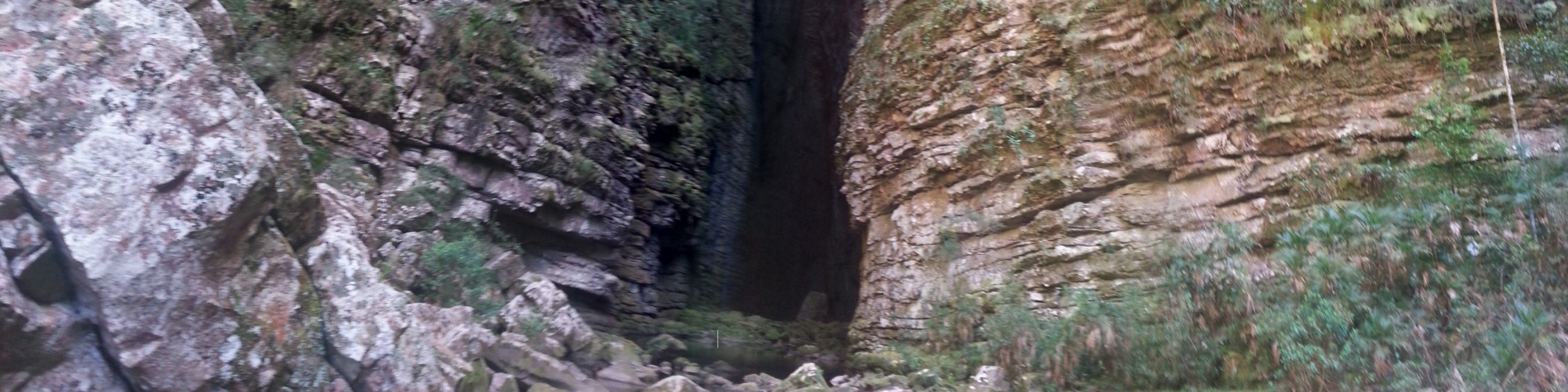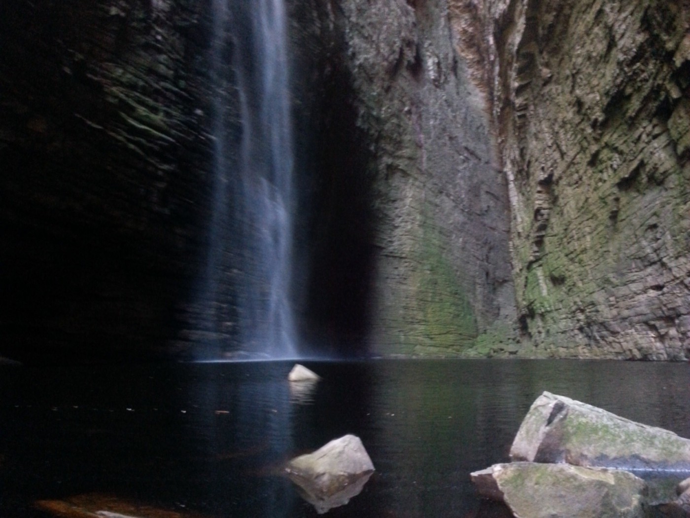 A fenda se fecha e torna o local um pouco escuro caso não seja meio dia, ou seja, é um local expremido pelo cânion. Observamos muitos passarinhos e morcegos voando e a vista da linda cachoeira, são 290 m de queda em um local é fantástico, o vento frio que vem da queda fumacenta, pedras frias e o corpo solicitando descanso após uma boa caminhada, momento para contemplar.