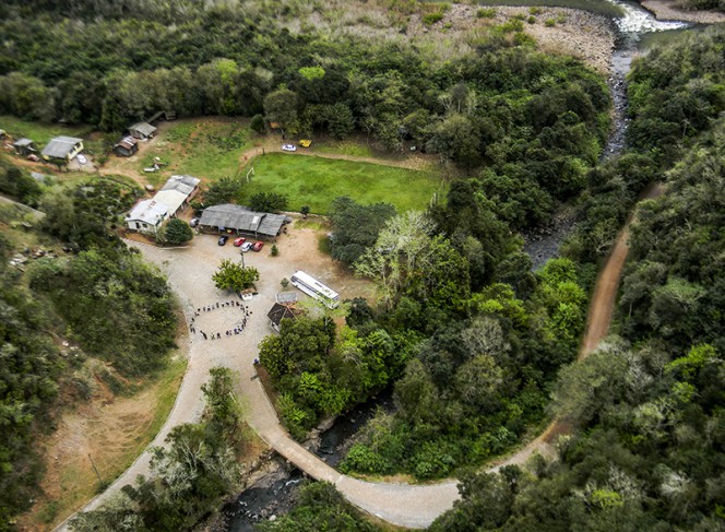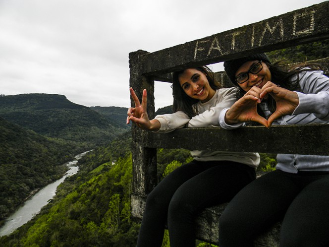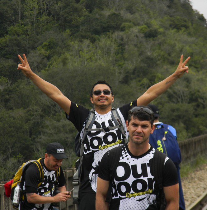 Quando retornei ao acampamento o casal de novos amigos já tinha acordado e estavam fazendo o café. Ficamos conversando por aproximadamente uma hora e resolvi que era hora de desmontar a barraca e organizar minha mochila. Ao terminar de arrumar minhas coisas, meus novos amigos convidaram para ir com eles até em cima do v13. Aceitei o convite, deixei minha mochila em um galpão da empresa chamada V13 Adventure, após solicitar autorização do pessoal que ali estava. Assim fui de carona no automóvel do casal até o topo do viaduto 13. Ao chegar ficamos admirando a neblina ir sumindo gradativamente e revelando cada vez mais a beleza do lugar. O casal seguiu para o viaduto 11, e eu, permaneci ali, sentado em um dos refúgios do viaduto, aguardando a chegada das empresas Gaia Travel e Trekking POA. Permaneci ali sentado por pouco tempo até que a galera chegasse na base do v13, aproveitei para fotografar a subida deles até o topo, onde eu me encontrava.