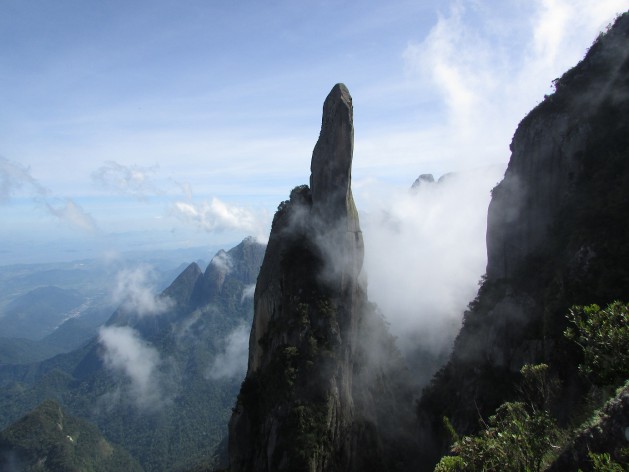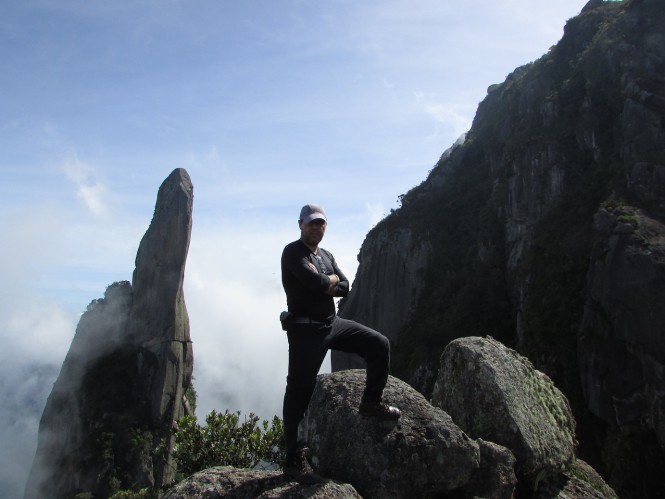 A partir daí vem uma subida íngreme, cerca de mais meia hora, primeiro em mata fechada que se abre em um capim alto no seu trecho final. Algumas observações, mantenha-se quando subindo sempre a direita na trilha, há uma variante a esquerda, onde eu ainda não fui, que leva a base da agulha. Irá chegar em um mirante, com o visual da Agulha, porém ai não é o cume, continue margeando a pedra pelo seu lado esquerdo, até a subida final que levará ao cume real, onde há o livro, e um visual fantástico da Agulha e do paredão da Pedra do Sino.
