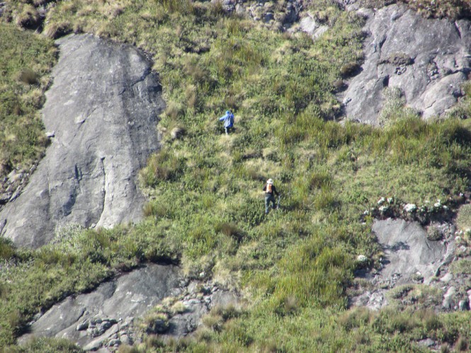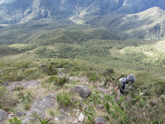 Quando encontramos a trilha de descida, alguns amigos do grupo foram fazer o ataque ao cume da Mina, eu como já tinha ido lá duas vezes resolvi não ir, já estava na metade da descida pro Ruah e não achei necessário. Depois foram fazer também um ataque ao Morro do Avião, o qual também não fui, fiquei com as cargueiras enquanto os amigos se divertiam.