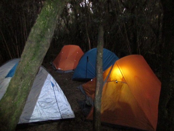 Não conseguimos atingir pedra da mina no primeiro dia, já que tínhamos um dia a mais acampamos numa área de bambu, há inclusive uma sinalização de camping, por volta de 16:30, como não dormimos na noite anterior devido a viagem, o cansaço era grande. Já chegaríamos no cume da Mina a noite e sem saber se teríamos local para acampar devido a trilha estar lotada, foi no feriado de Corpus Christi, e não sei se a informação é correta, mas me disseram ter havido quase 700 pessoas na Serra Fina. Preferimos montar acampamento ali mesmo, já era final de dia, a área é muito boa, abrigada e limpa, e descansar do cansaço da viagem e do primeiro dia.