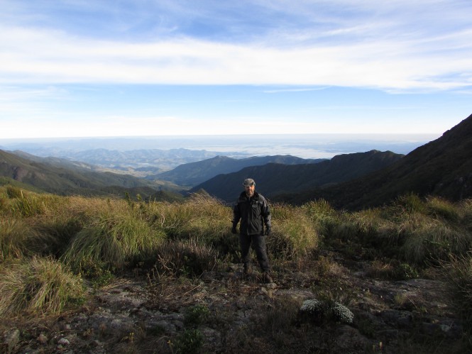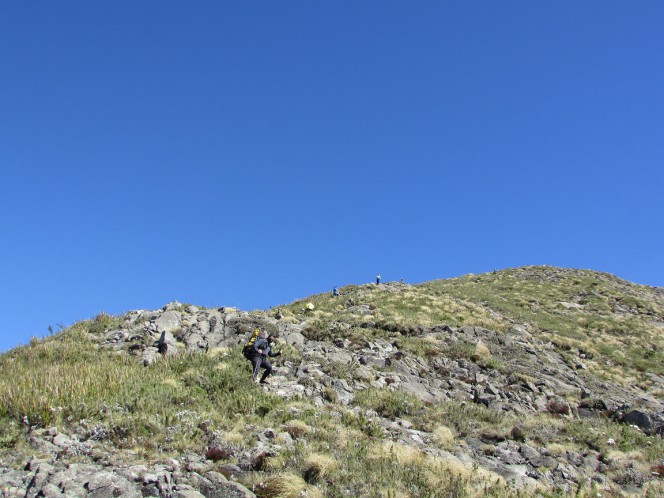 Após o retorno do ataque seguimos caminho para o pico dos 3 Estados já imaginava que teríamos problemas para acampar devido ao número de pessoas que passaram pela gente enquanto esperávamos. Mas a realidade foi bem pior do que sonhava minha vã filosofia. Não era possível caminhar direito no pico dos 3 Estados sem esbarrar em alguém ou pedir licença para não pisar em outro, totalmente inacreditável. Fizemos a tradicional foto no marco e descemos, já imaginando aonde poderíamos acampar, porque apesar de possível, seria desgastante seguir até o Pierre neste mesmo dia. E a van só nos pegaria no dia seguinte. Logo no final da descida há uma área de capim, que igualmente estava lotada. Andamos um pouco mais até uma crista rochosa, era por volta de 15 hs, cedo para parar de caminhar. Porém depois desse ponto não haveria nenhum ponto onde colocar nossas 5 barracas. Seria ali ou direto ao Pierre. Tomamos a decisão de ficar, não havia porque correr visto que nosso resgate só seria as 14 horas do dia seguinte. Foi a melhor decisão que tomamos, depois que ali paramos, vários montanhistas resolveram o mesmo que nós, mesmo caindo a noite, continuava chegando gente, parecia Pedra da Gávea dia de domingo. Todas as noites foram tranquilas não teve frio exagerado e dormi bem, sem problemas.