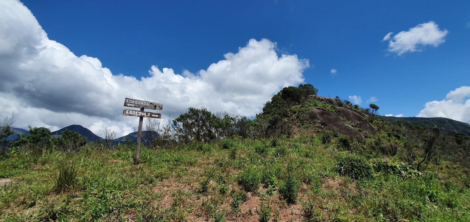 A trilha vai dar no meio do platô-cume do Camelo, onde há placa indicando o caminho para a Corcova 1, à esquerda, ou Corcova 2, à direita.
