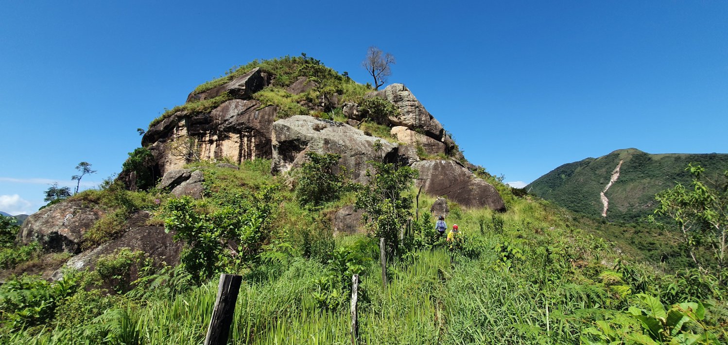 Cerca de 300 metros após o início da trilha, chega-se a um platô utilizado pela comunidade do entorno como local de oração (ainda que não tivesse ninguém ali no momento). Passamos para o outro lado da cerca de arame farpado, à direita de quem sobe, e tocamos para cima.