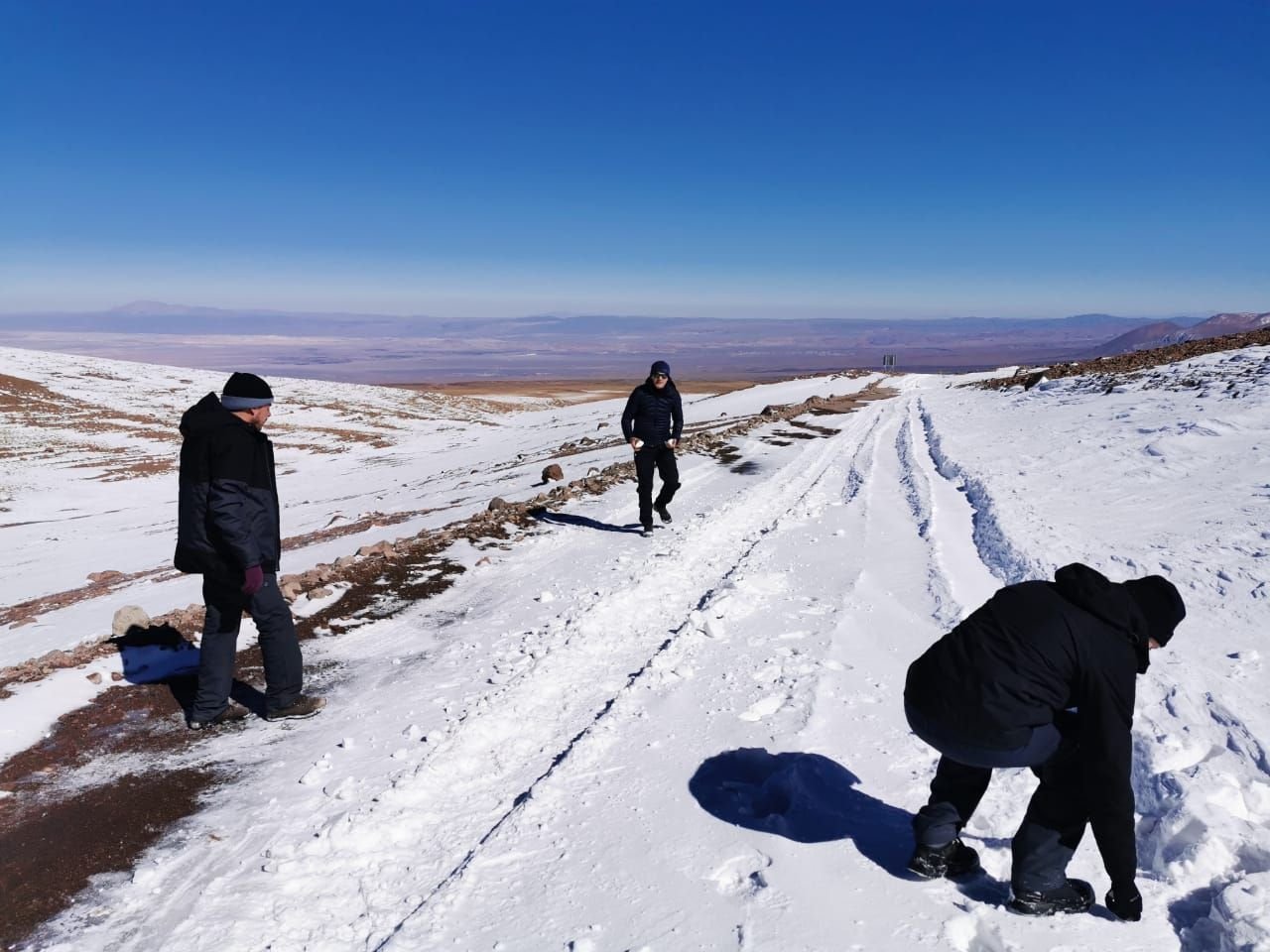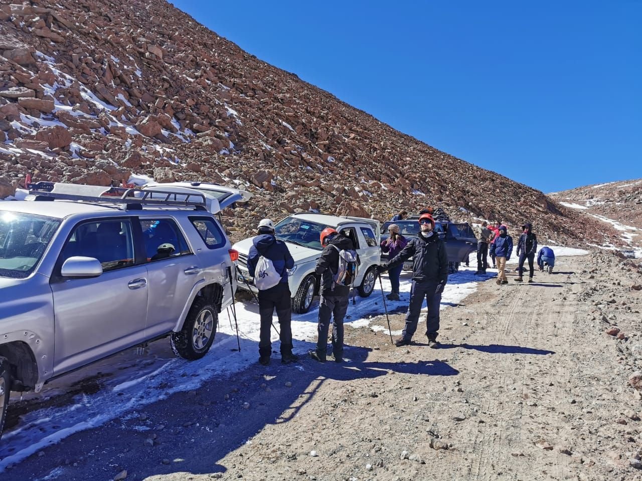 O guia nos buscou no hostel ás 9h da manhã e nos levou de carro ao local. Estava marcado para sair mais cedo, porém havia uma barreira na estrada na parte da manhã por conta de obras que estavam em andamento. Tinha nevado muito por ali nos dias anteriores, inclusive alguns pontos turísticos no Atacama estavam fechados por conta disso. O guia nos avisou que faríamos um caminho alternativo, e também mais longo, para subir o vulcão, pois também por conta da neve o caminho mais conhecido estava fechado.
