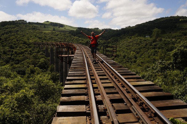 Popular travessias no RS. A travessia é feita sobre os trilhos com um total de 26 pontes e 34 túneis.